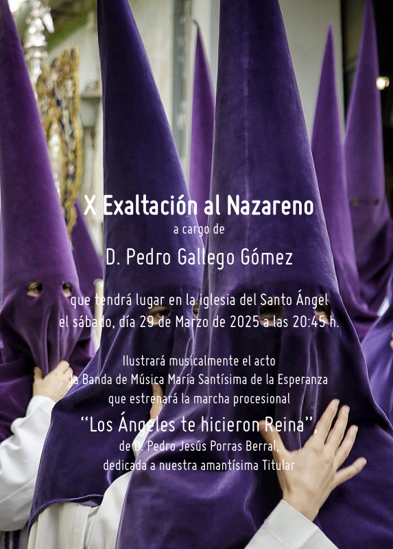 X Exaltación al Nazareno organizada por la Hermandad a cargo de D. Pedro Gallego Gómez. El acto estará ilustrado por la Banda de Música "María Santísima de la Esperanza" que […]