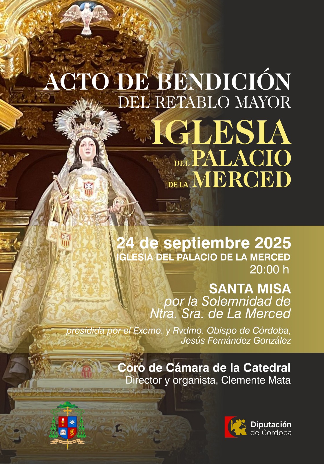 Acto de bendición del Retablo Mayor de la Iglesia de la Merced y Solemne Eucaristía presidida por D. Jesús Fernández González, Obispo de Córdoba, a las 20:00 horas. Actuará el Coro de Cámara de la Catedral de Córdoba dirigido por D. Clemente Mata.