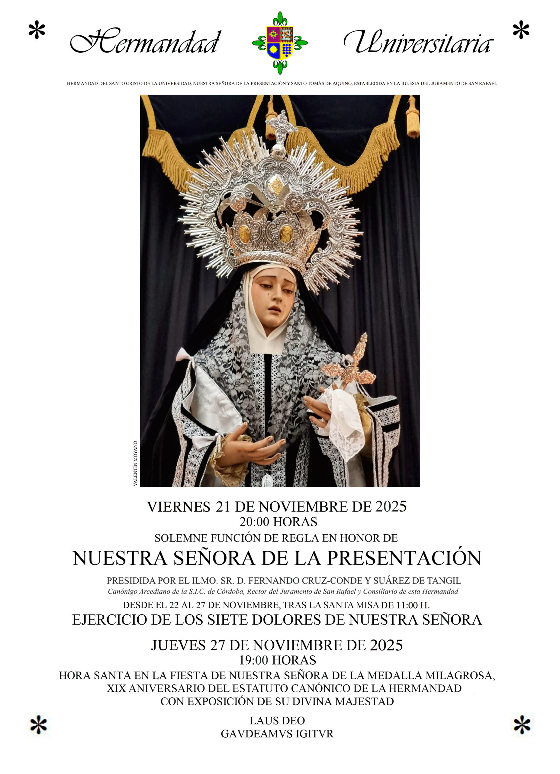 Solemne Función de Regla en honor de Nuestra Señora de la Presentación, a las 20:00 horas en la Iglesia del Juramento de San Rafael.