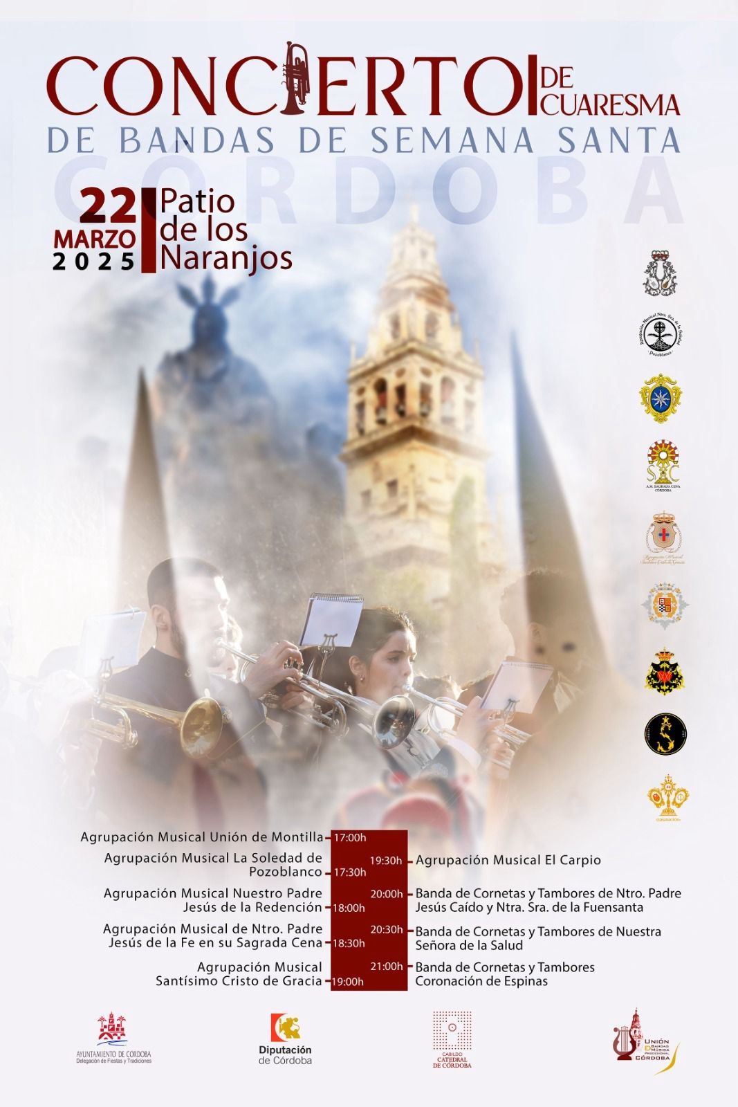 Concierto de Cuaresma de Bandas de Semana Santa a partir de las 17:00 horas en el Patio de los Naranjos. Las bandas participantes son: