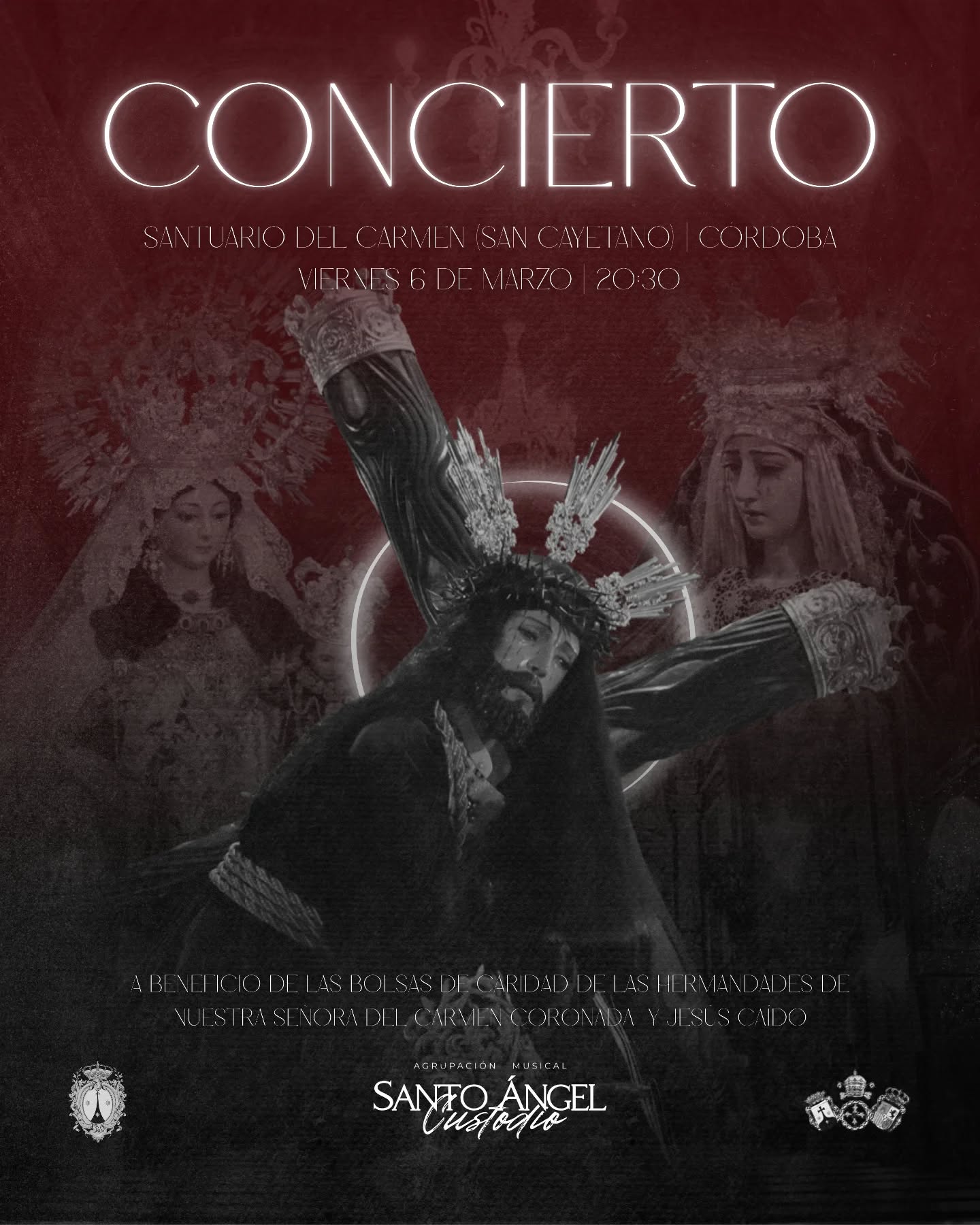 Concierto de la Agrupación Musical «Santo Ángel Custodio» de Rute (Córdoba) a beneficio de las bolsas de caridad de las Hermandades de Jesús Caído y Carmen de San Cayetano, a las 20:30 horas en el Santuario del Carmen de San Cayetano.