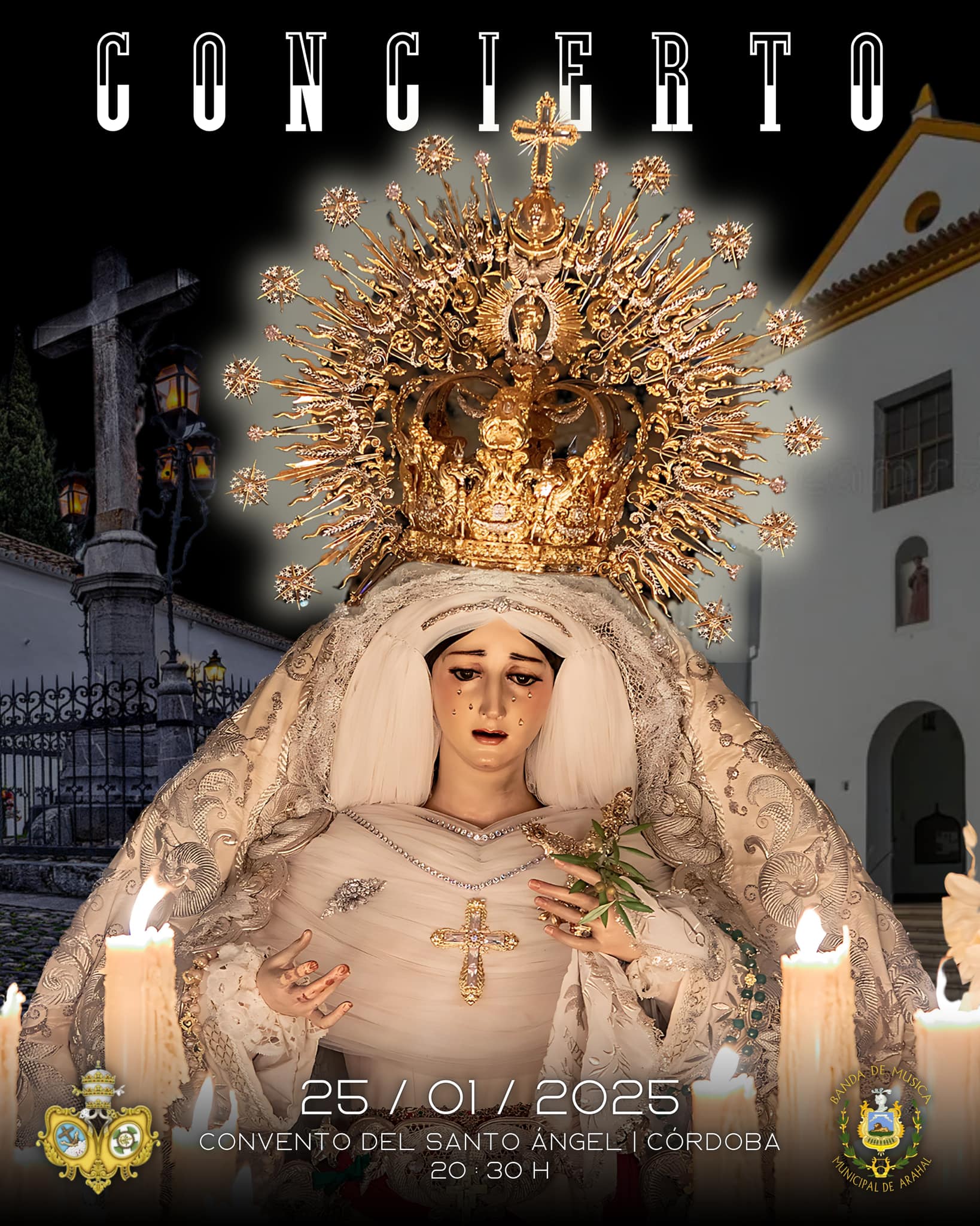 Concierto de marchas procesionales a cargo de la Banda de Música Municipal de Arahal (Sevilla), a las 20:30 horas en la Iglesia Conventual del Santo Ángel (Capuchinos).