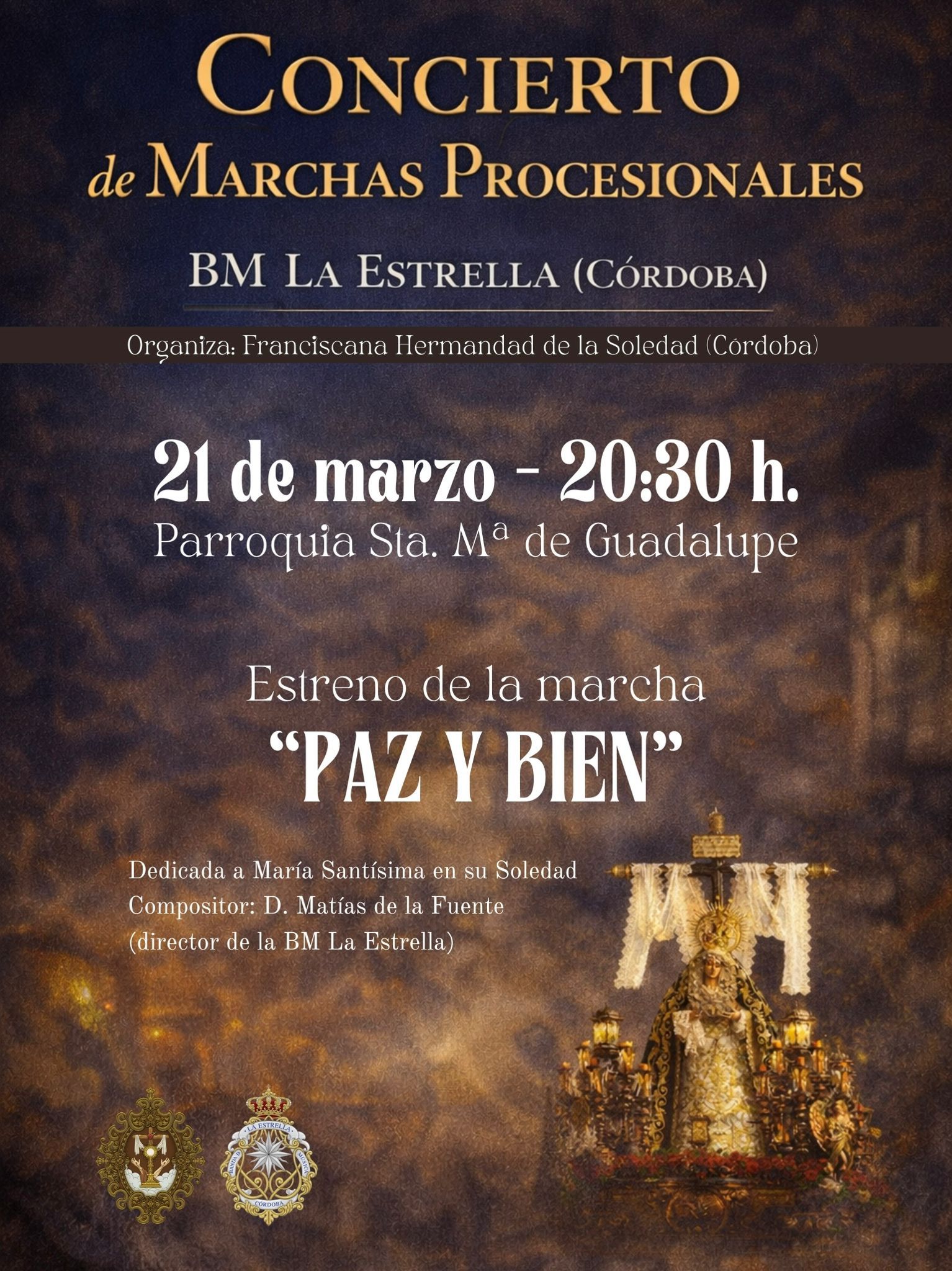 Concierto de marchas procesionales a cargo de la Banda de Música «Nuestra Señora de la Estrella» de Córdoba, a las 20:30 horas en la Parroquia de Santa María de Guadalupe (Franciscanos). Se estrenará la marcha «Paz y Bien» compuesta por D. Matías de la Fuente directo de la banda.