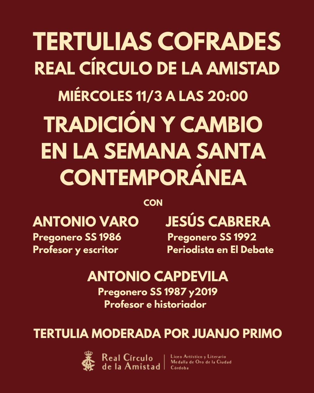 Real Círculo de la Amistad C. Alfonso XIII, 14, Centro, 14001 Córdoba, Córdoba, EspañaTertulia de Cuaresma titulada "Tradición y cambio en la Semana Santa contemporánea" participando en ella, D. Antonio Varo, Pregonero de la Semana Santa 1986, profesor y escritor, D. Jesús Cabrera, Pregonero de la Semana Santa 1992 y periodista en "El Debate" y D. Antonio Capdevila, Pregonero de la Semana Santa 1987 y 2019, profesor e […]