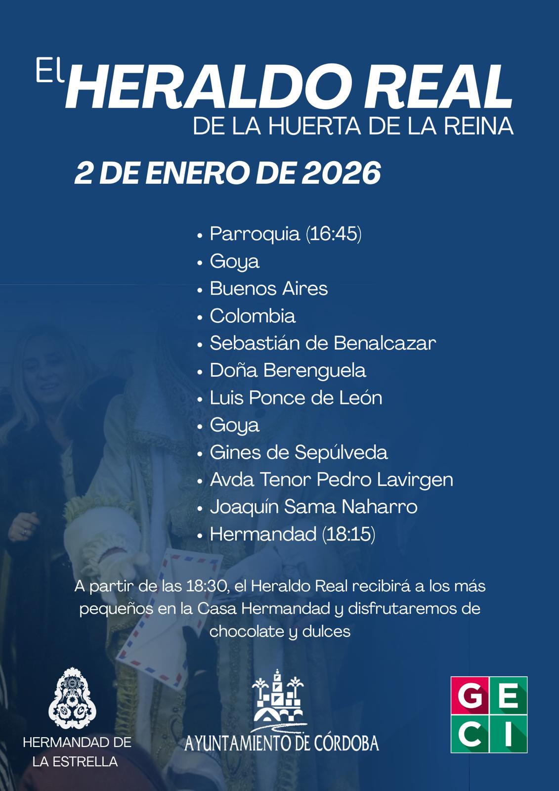 Heraldo Real de la Huerta de la Reina 2026 desde la Parroquia de San Fernando siguiendo este itinerario: Salida (16:45 horas), Goya, Buenos Aires, Colombia, Sebastián de Belalcázar, Doña Berenguela, Luís Ponce de León, Goya, Ginés de Sepúlveda, Avenida Tenor Pedro Lavirgen, Joaquín Sama Naharro y Casa de Hermandad de la Estrella (18:15 horas). A partir de las 18:30 horas, el Heraldo Real recibirá a los más pequeños en la Casa de Hdad. donde habrá chocolate y dulces.