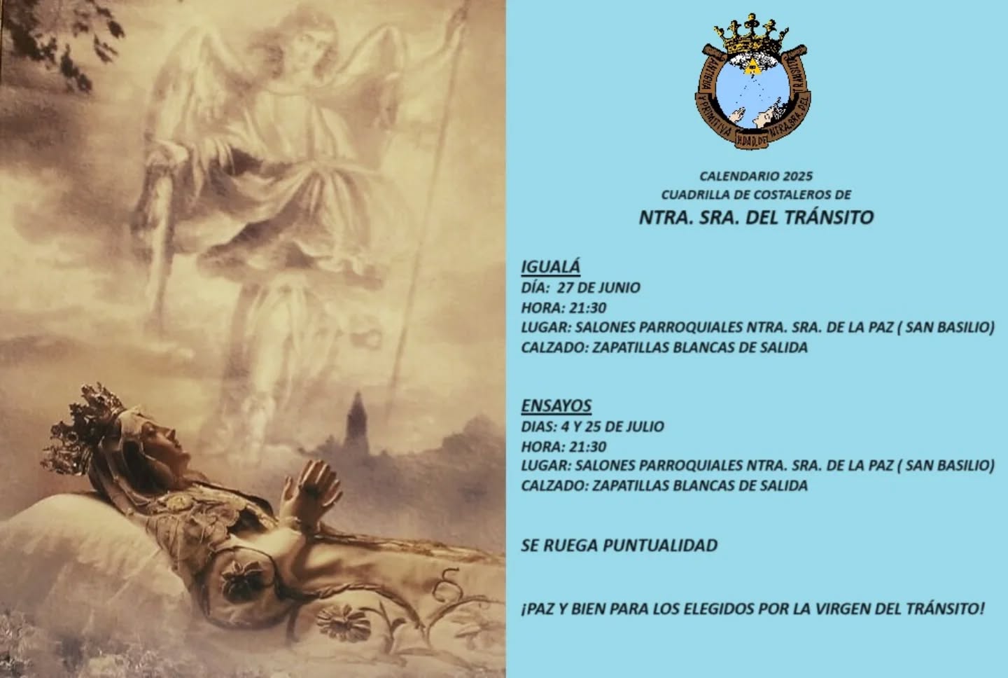 Igualá de costaleros de Nuestra Señora del Tránsito, a las 21:30 horas en los Salones Parroquiales de Nuestra Señora de la Paz (San Basilio).