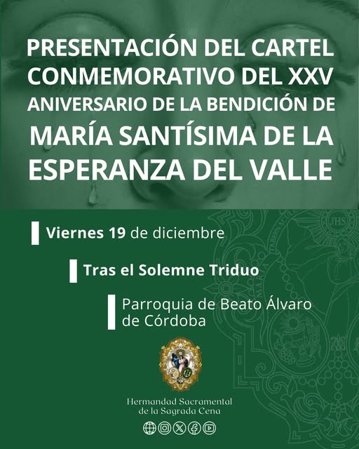 Presentación del cartel conmemorativo del XXV aniversario de la bendición de María Santísima de la Esperanza del Valle a las 20:45 horas en la Parroquia del Beato Álvaro de Córdoba.