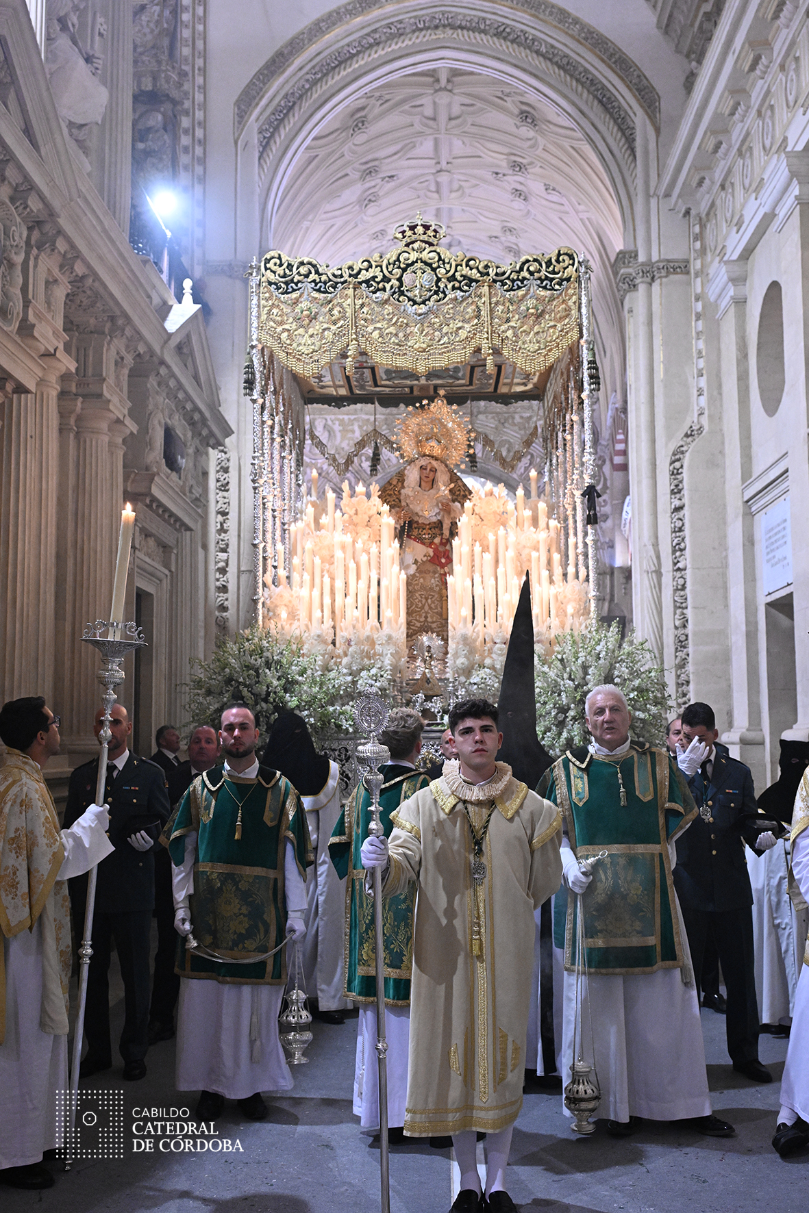 Salida de la Parroquia de San Andrés Apóstol (18:40 horas), Plaza de San Andrés, San Pablo, Capitulares (19:10 horas), Diario de Córdoba, San Fernando (19:30 horas), Cruz del Rastro (20:00 horas), Ronda de Isasa, Triunfo (20:30 horas), Santa Teresa Jornet, Entrada C.O (20:49 horas), Amador de los Ríos, Altar San Álvaro (20:54 horas), Torrijos, Puerta del Perdón (21:09 horas) Puerta de las Cofradías (21:19 horas), Patio de los Naranjos (21:30 horas), Puerta de Santa Catalina, Magistral González Francés, Cardenal González (22:00 horas), Cruz del Rastro, San Fernando (22:30 horas), Diario de Córdoba (23:00 horas), Capitulares, San Pablo (23:30 horas), Plaza de San Andrés y Entrada (23:40 horas).