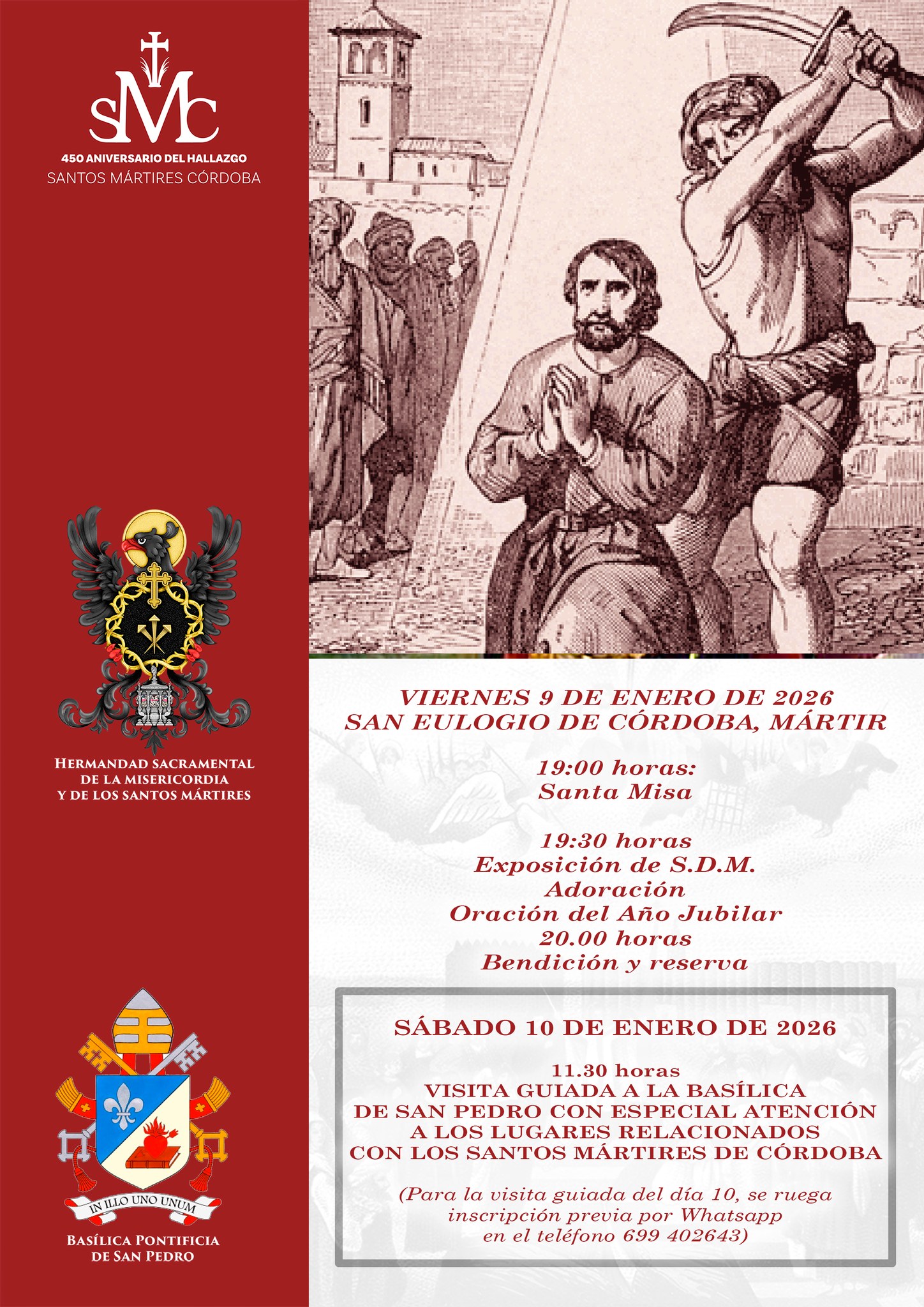 Santa Misa en honor de San Eulogio de Córdoba, Mártir, a las 19:00 horas en la Basílica de San Pedro. A las 19:30 horas, Exposición de su Divina Majestad, Adoración y Oración Jubilar. A las 20:00 horas, Bendición y reserva.