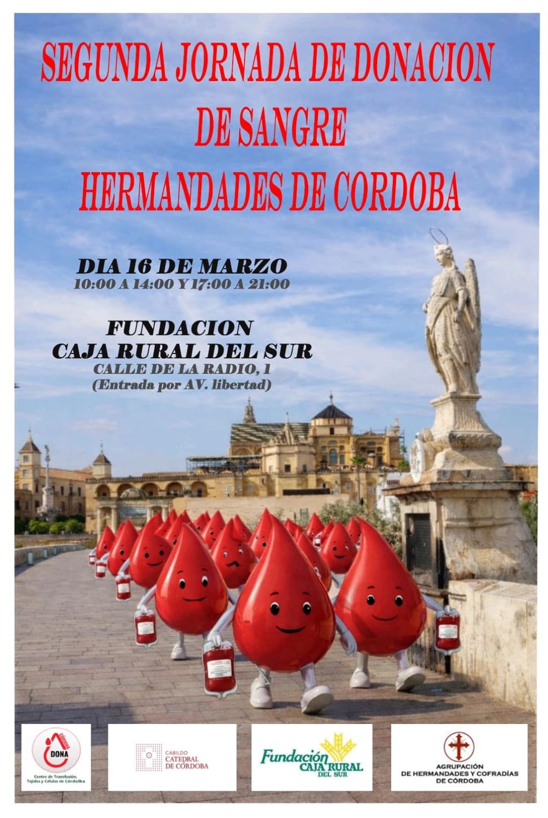 Segunda jornada de donación de sangre de las Hermandades de Córdoba en horario de 10:00 a 14:00 horas y de 17:00 a 21:00 horas en la Fundación Caja Rural del Sur sita en la Avenida de la Libertad.