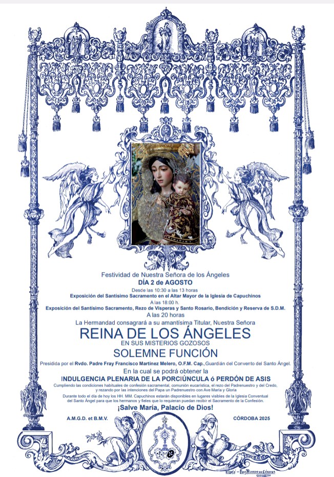 Solemne Función en honor de Nuestra Señora Reina de los Ángeles en sus Misterios Gozosos, a las 20:00 horas en la Iglesia Conventual del Santo Ángel (Capuchinos).