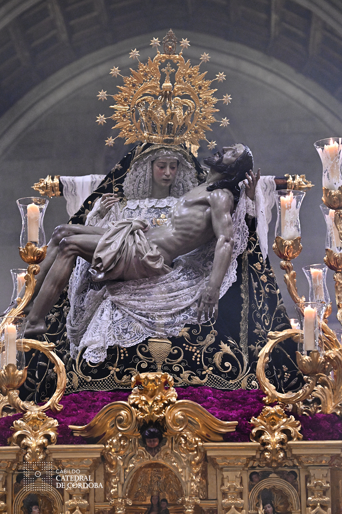 Salida de la Santa Iglesia Catedral (18:10 horas), Patio de los Naranjos, Puerta del Perdón, Cardenal Herrero, Judería (18:30 horas), Deanes, Conde y Luque, Plaza Agrupación de Cofradías (19:00 horas), Blanco Belmonte, Ángel de Saavedra, Juan Valera, Santa Victoria (19:30 horas), Plaza de la Compañía, Conde de Cárdenas, María Cristina (20:00 horas), Claudio Marcelo, Capitulares, Alfaros (20:30 horas), Puerta del Rincón, Pasaje de la Estrella (21:00 horas), Plaza Conde de Priego, Plaza de Santa Marina, Morisco, Obispo López Criado (21:40 horas), San Agustín, Plaza de San Agustín y Entrada (22:10 horas).