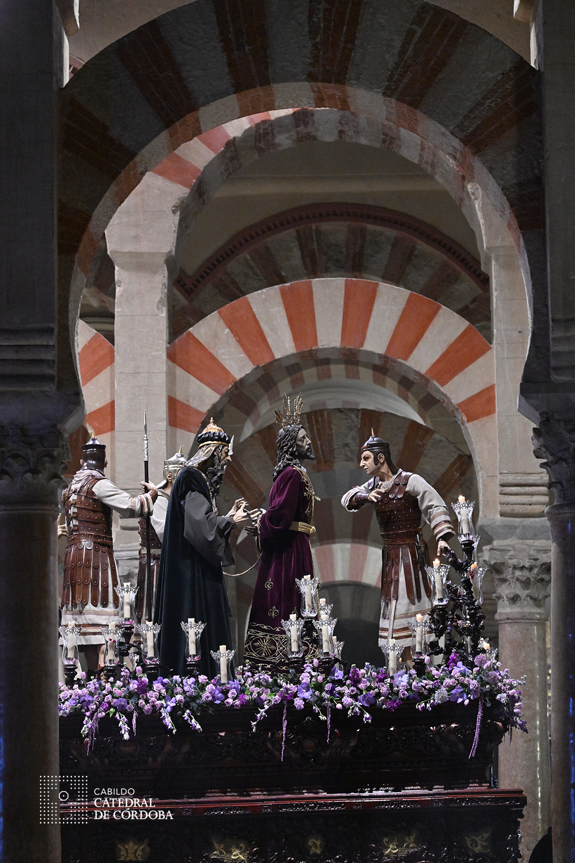 Salida de la Santa Iglesia Catedral (19:30 horas), Patio de los Naranjos, Puerta del Perdón, Cardenal Herrero, Judería, Deanes (20:00 horas), Conde y Luque, Plaza Agrupación de Cofradías, Blanco Belmonte (20:30 horas), Barroso, Plaza de San Juan, Leopoldo de Austria (21:00 horas), Valladares, Leiva Aguilar, Buen Pastor y Entrada (21:10 horas).