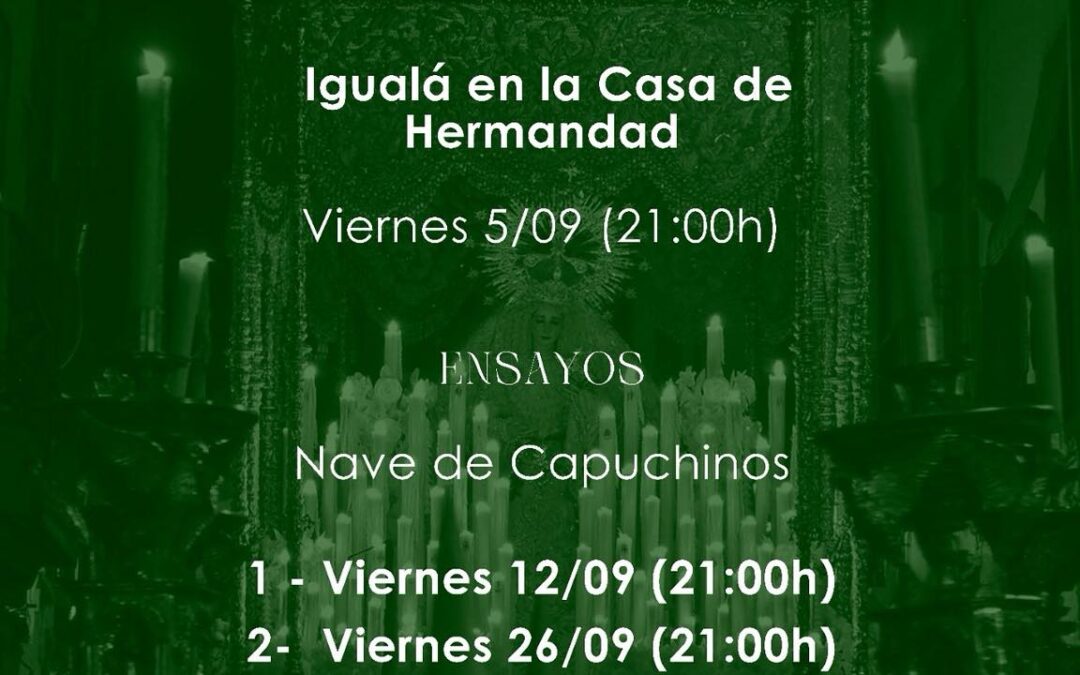 Solemne Eucaristía en honor de María Santísima de la Paz y Esperanza Coronada con motivo del LXXXVI aniversario de su bendición, a las 20:00 horas en la Iglesia Conventual del Santo Ángel (Capuchinos).